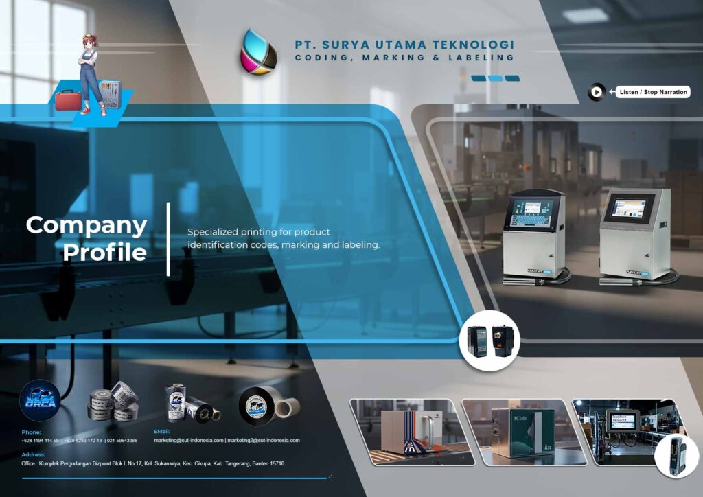 PT. Surya Utama Teknologi berkomitmen menyediakan solusi coding marking terdepan untuk pencetakan di lini industri anda, —barcode, tanggal kedaluwarsa, kode produksi hingga label produk. Dengan dukungan dari teknologi yang paling mutakhir, kami siap mendukung proses pencetakan identifikasi produk dengan cepat, akurat dan sesuai dengan regulasi kepatuhan standar, disertai dukungan teknis yang andal.